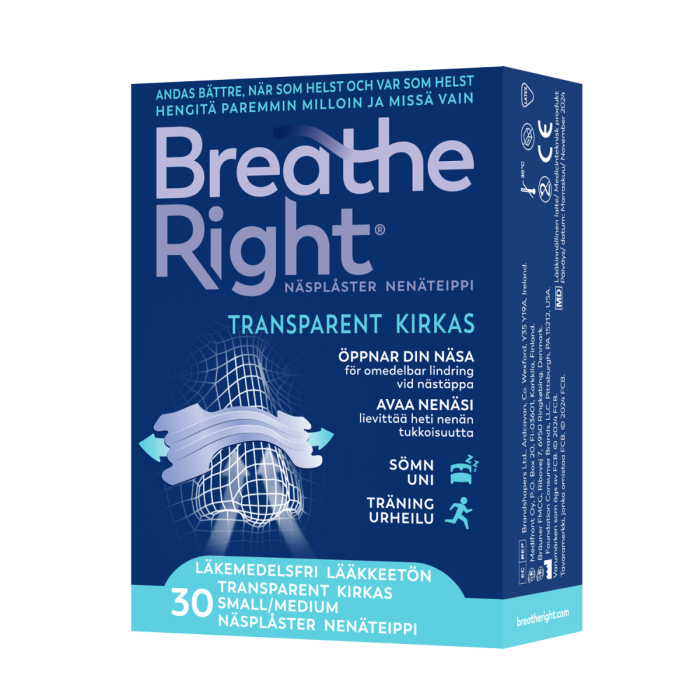 Breathe Right® nenäteippi lievittää välittömästi nenän tukkoisuutta, joka voi johtua vilustumisesta, allergioista tai nenän väliseinän vinoudesta. Lisäksi sen on kliinisesti todistettu vähentävän kuorsausta, mikä tekee siitä tehokkaan ja lääkkeettömän vaihtoehdon hengityksen helpottamiseen sekä yöllä että päivällä. Breathe Right® nenäteippi on joustava ja jousimainen teippi, joka hellävaraisesti avaa nenää/sieraimet ja parantaa ilmavirtausta, mikä auttaa hengittämään helpommin. Säilytä alle 30 °C. Säilytä alkuperäispakkauksessa. Tuotetta ei saa käyttää pakkaukseen merkityn viimeisen käyttöpäivän jälkeen. Valmistaja Foundation Consumer Brands.