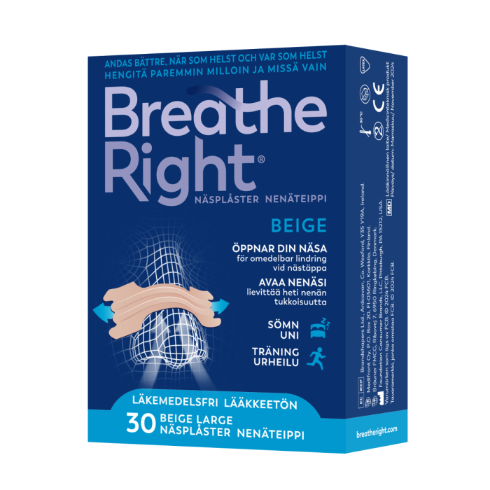 Breathe Right® nenäteippi lievittää välittömästi nenän tukkoisuutta, joka voi johtua vilustumisesta, allergioista tai nenän väliseinän vinoudesta. Lisäksi sen on kliinisesti todistettu vähentävän kuorsausta, mikä tekee siitä tehokkaan ja lääkkeettömän vaihtoehdon hengityksen helpottamiseen sekä yöllä että päivällä. Breathe Right® nenäteippi on joustava ja jousimainen teippi, joka hellävaraisesti avaa nenää/sieraimet ja parantaa ilmavirtausta, mikä auttaa hengittämään helpommin. Säilytä alle 30 °C. Säilytä alkuperäispakkauksessa. Tuotetta ei saa käyttää pakkaukseen merkityn viimeisen käyttöpäivän jälkeen. Valmistaja Foundation Consumer Brands.