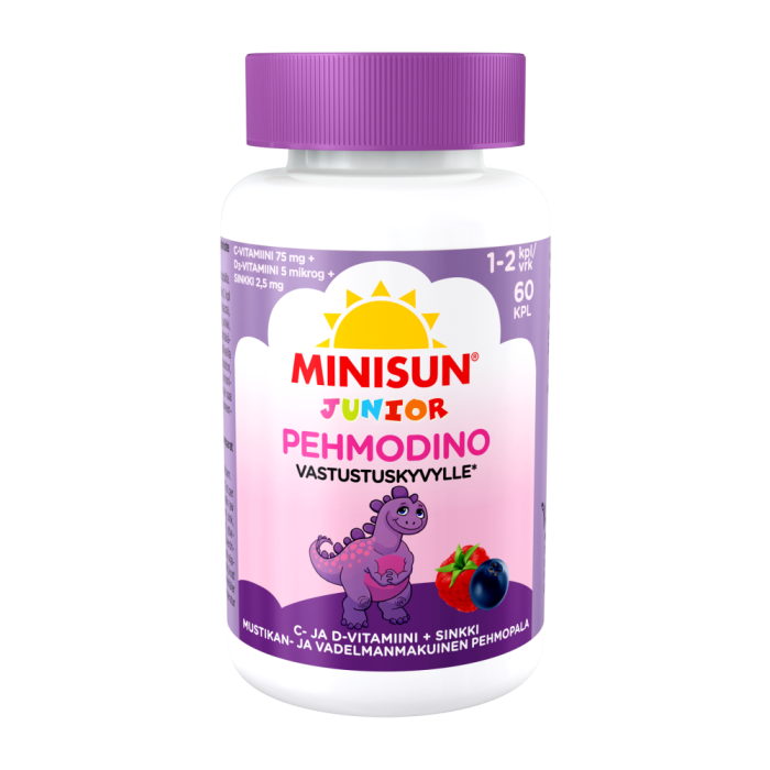 Minisun Pehmodino Super Defence on pureskeltava ravintolisä D3- ja C-vitamiinin sekä sinkin saannin turvaamiseen erityisesti lapsilla. Minisun Pehmodino Super Defence on hyvänmakuinen pehmeä ja pureskeltava lasten vitamiini- ja hivenainevalmiste vastustuskyvylle. Minisun Pehmodino sisältää D3- ja C-vitamiinia, sinkkiä ja hunajaa. D-vitamiini on tarpeellinen lasten luuston ja hampaiden pysymiselle normaaleina. Lisäksi D-vitamiini edistää immuunijärjestelmän normaalia toimintaa lapsilla. Pehmodino on dinosauruksen muotoinen mustikan ja vadelman makuinen pehmeä ja pureskeltava. Tuote sisältää vain luontaisia värejä ja aromeja. Valmiste on maidoton, laktoositon, gluteeniton ja soijaton.